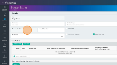 5. Give your extra group a name, and you can also choose here if you want to give your extra group a minimum or maximum limit. For instance if you wanted to create an extra group for steak temperatures, and limit your staff to only choosing one temperature per steak.