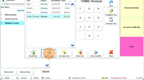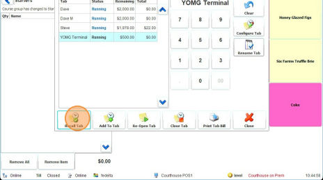 Tip! You can close the tab, and print the tab bill from the tabs screen. To pay the tab, just open the tab as if you were going to charge something to the tab, then process the payment by pressing the total button or another tender type, just like you would for a fast sale.