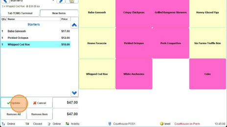 5.Enter the items you wish to add to the tab and then hit "update" to send those items to the kitchen/charge to the tab.